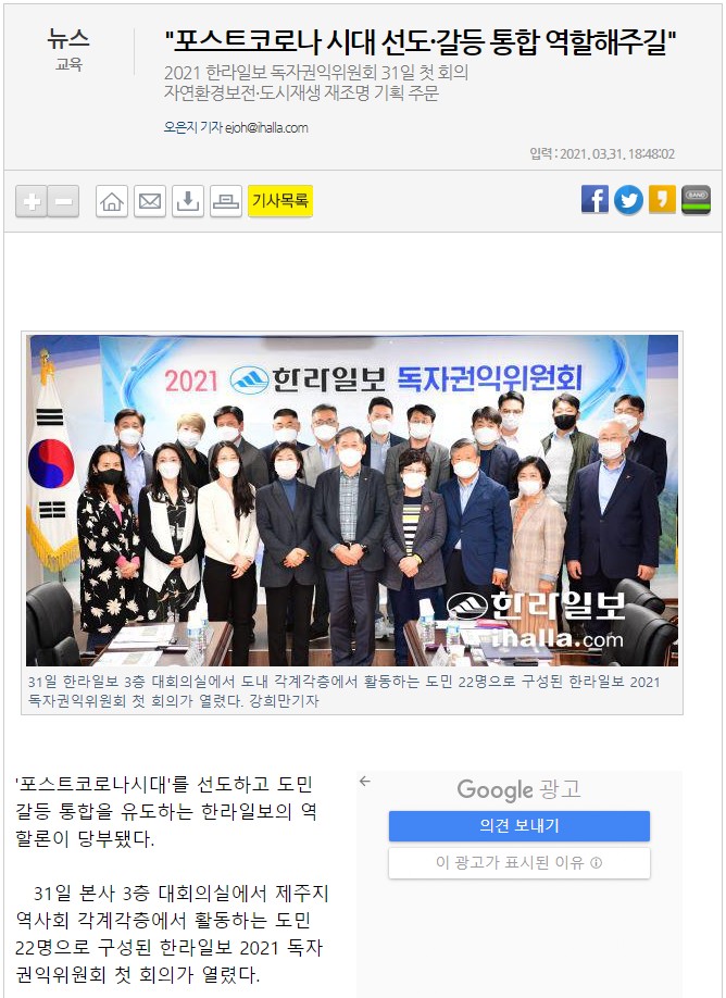 [2021년 한라일보 독자권익위원회] "포스트코로나 시대 선도·갈등 통합...