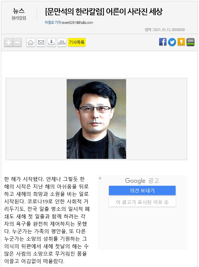 [문만석의 한라칼럼] 어른이 사라진 세상