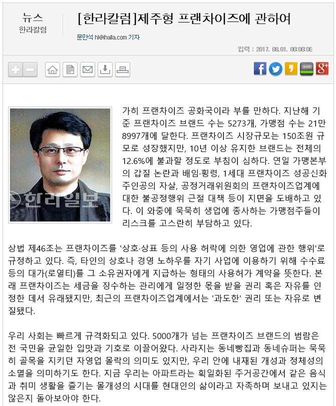 [한라칼럼] 제주형 프렌차이즈에 관하여