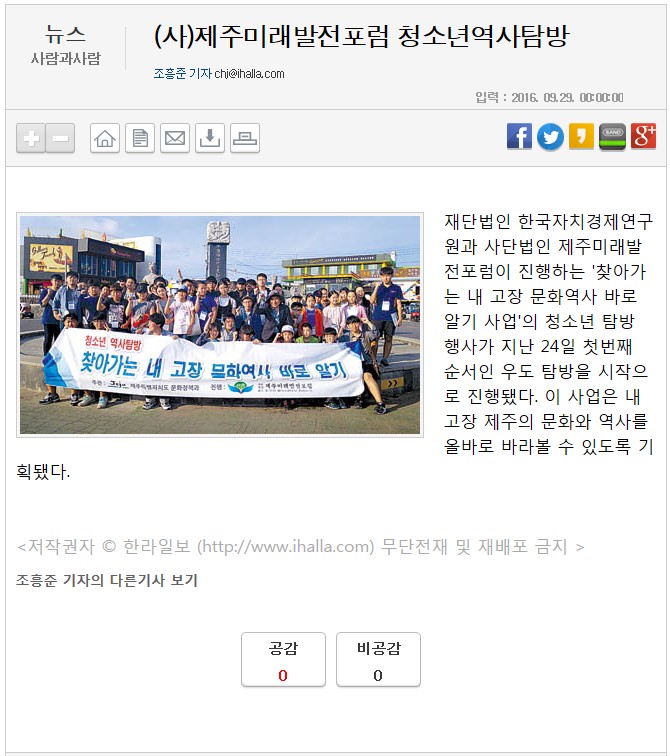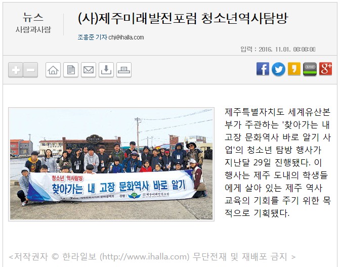[한라일보] '내고장 제주의 아름다움' 청소년 역사탐방 운영