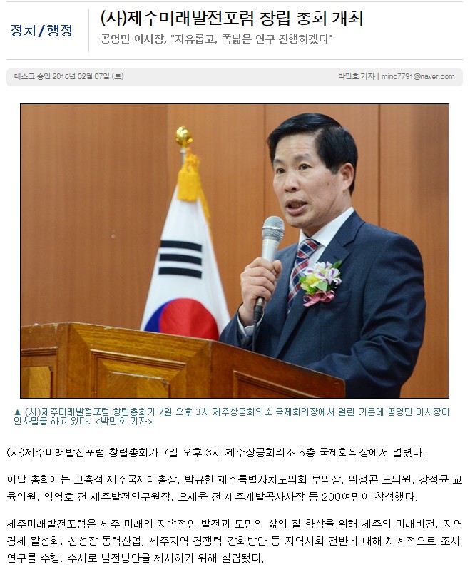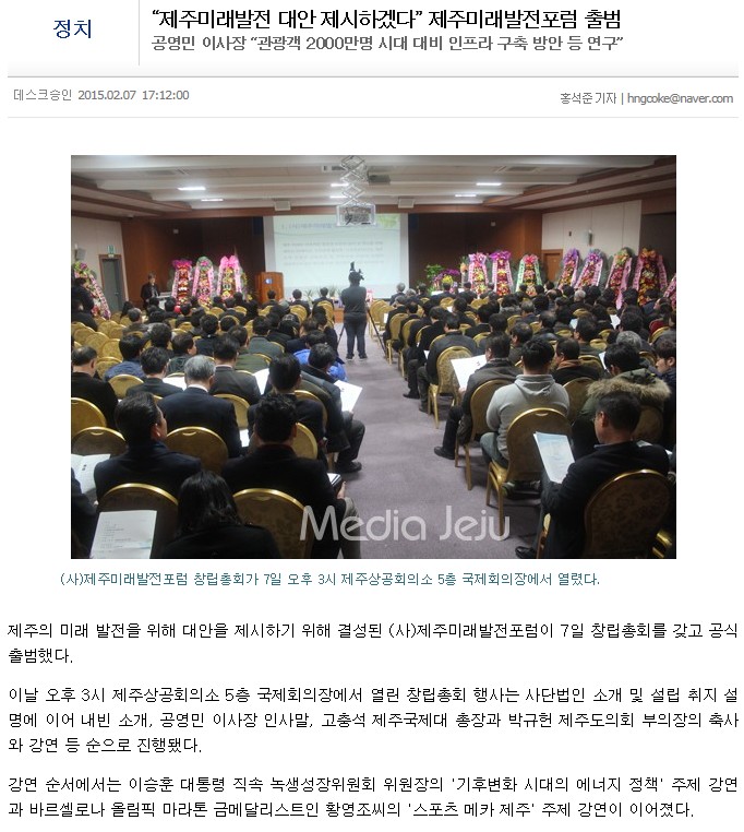 <제주매일> (사)제주미래발전포럼 창립 총회 개최 (2015.02.07)
