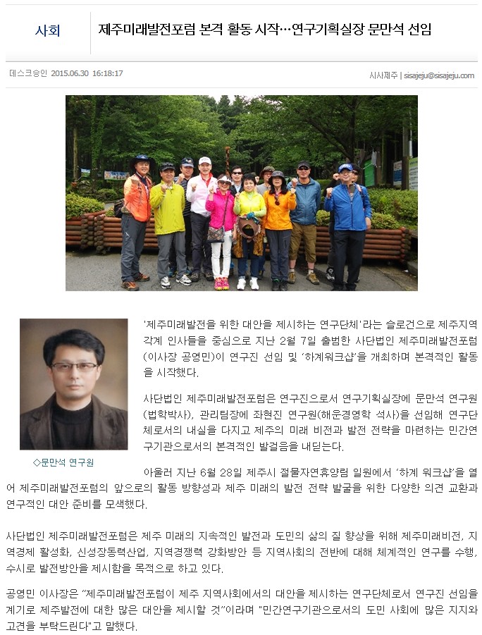 <시사제주> 제주미래발전포럼 본격 활동 시작…연구기획실장 문만석 선...