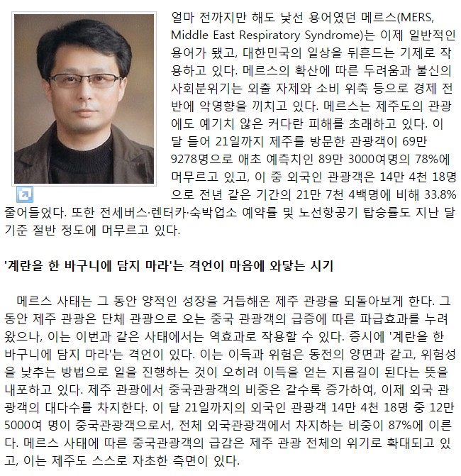 <한라일보> 메르스로 되새기는 제주관광 (2015. 6. 29)