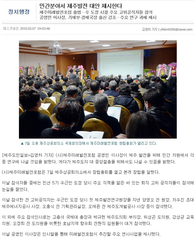 <제주도민일보> 민간분야서 제주발전 대안 제시한다 (2015.02.07)