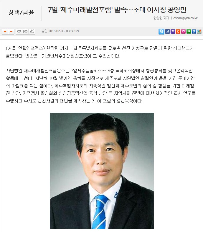 <연합인포맥스> 7일 '제주미래발전포럼' 발족...초대 이사장 공영민 (2...