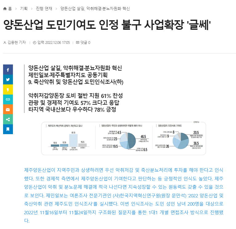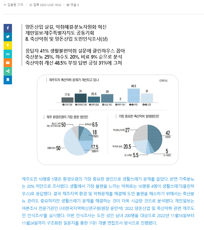 [제민일보] 도민 악취피해 축산분뇨 보다 생활쓰레기 원인 인식