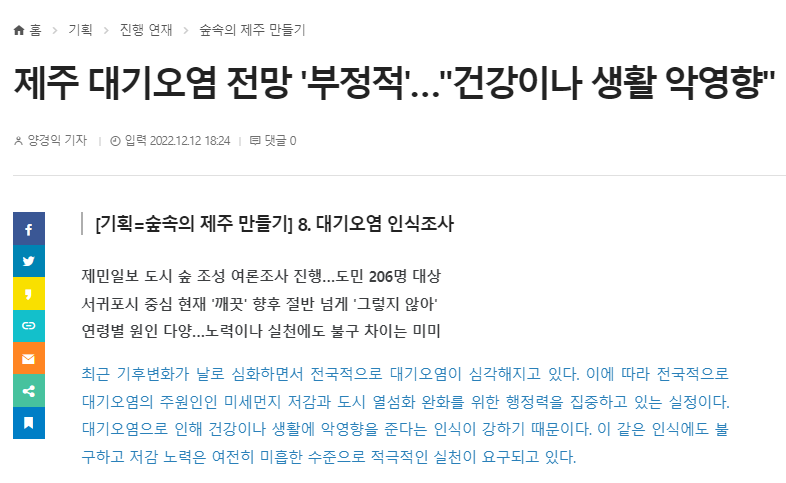 [제민일보] 제주 대기오염 전망 '부정적'…"건강이나 생활 악영향"