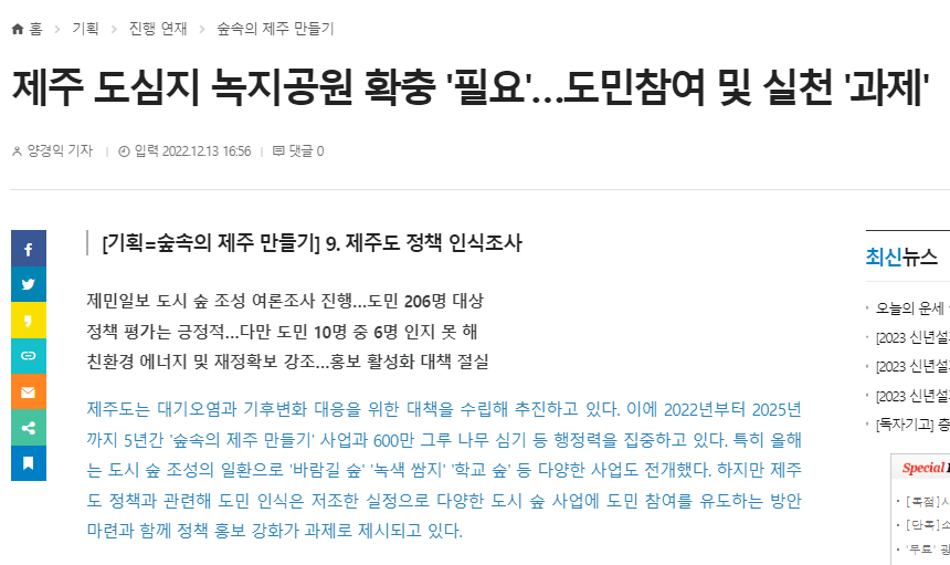 [제민일보] 제주 도심지 녹지공원 확충 '필요'…도민참여 및 실천 '과제...