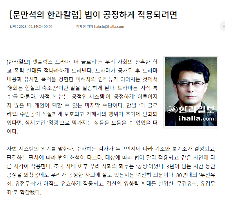 [문만석의 한라칼럼] 법이 공정하게 적용되려면
