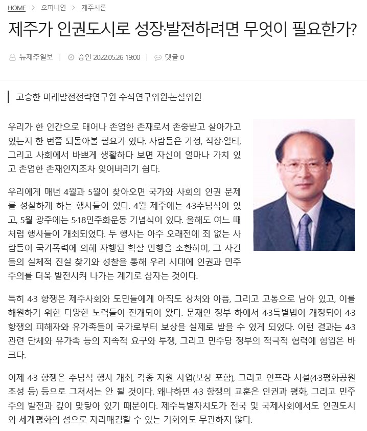 [뉴제주일보_제주시론] 제주가 인권도시로 성장·발전하려면 무엇이 필...