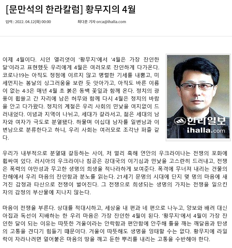 [문만석의 한라칼럼] 황무지의 4월