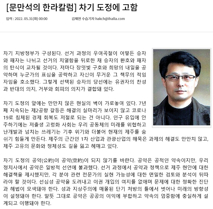 [문만석의 한라칼럼] 차기 도정에 고함