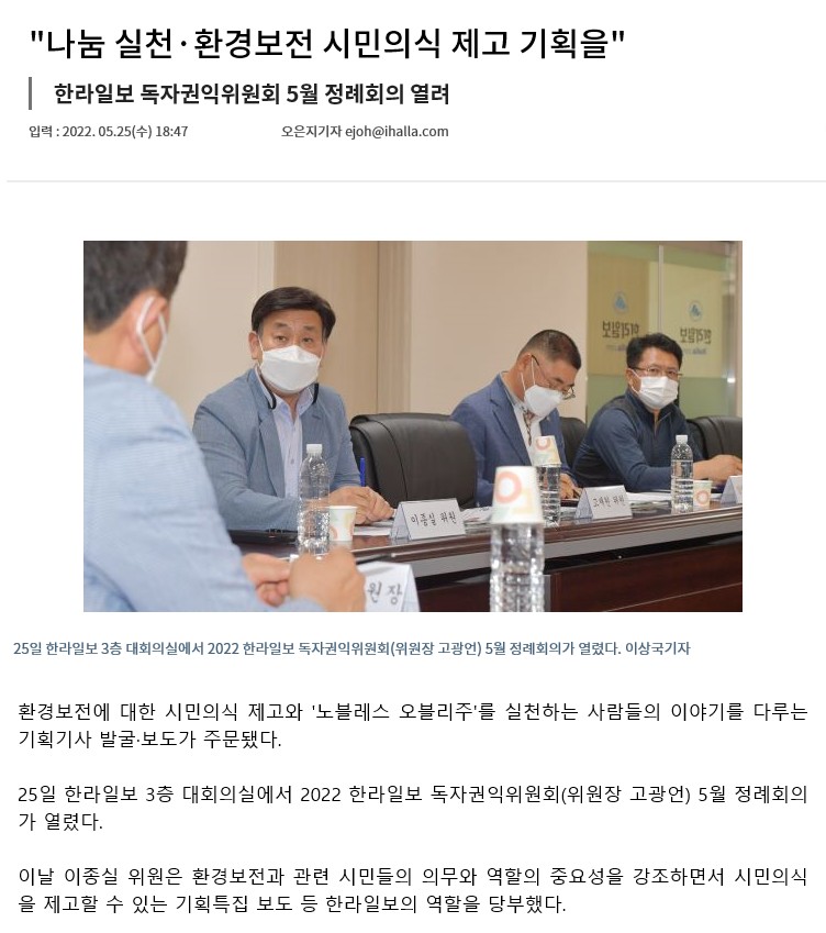 [한라일보] "나눔 실천·환경보전 시민의식 제고 기획을" 한라일보 독자...