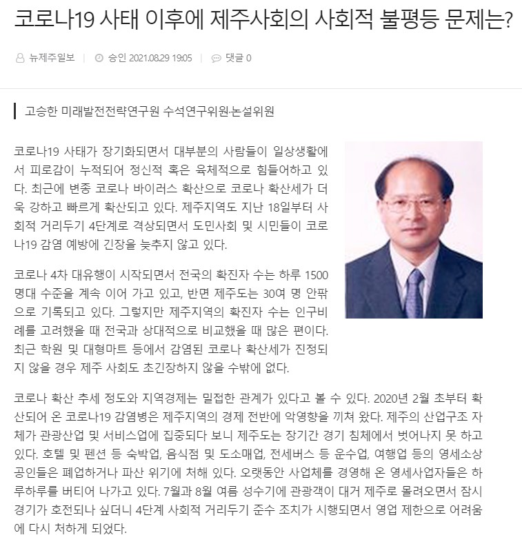 [뉴제주일보_제주시론] 코로나19 사태 이후에 제주사회의 사회적 불평등...