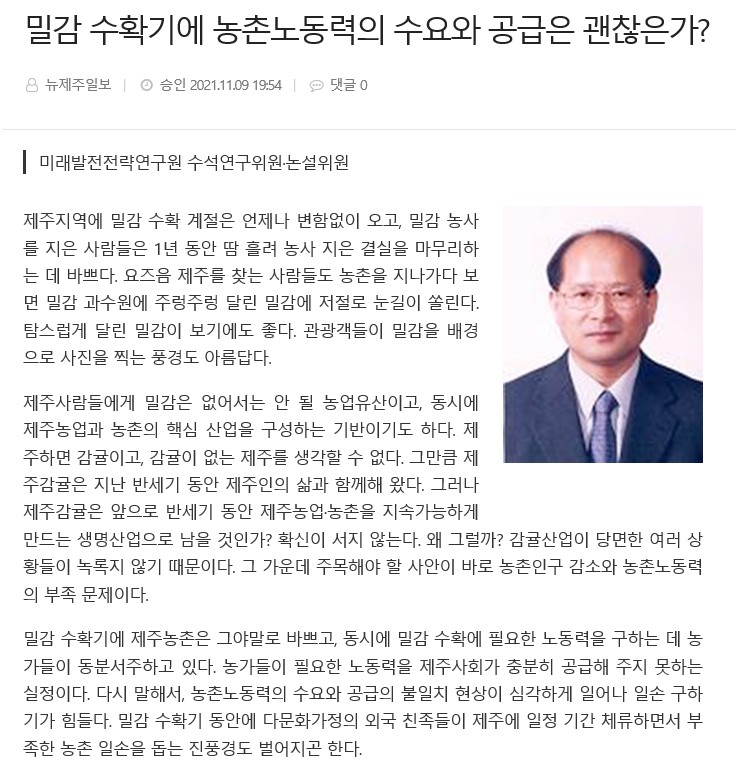 [뉴제주일보_제주시론] 밀감 수확기에 농촌노동력의 수요와 공급은 괜찮...