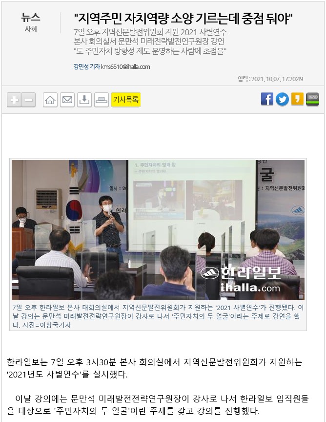 [한라일보] "지역주민 자치역량 소양 기르는데 중점 둬야"