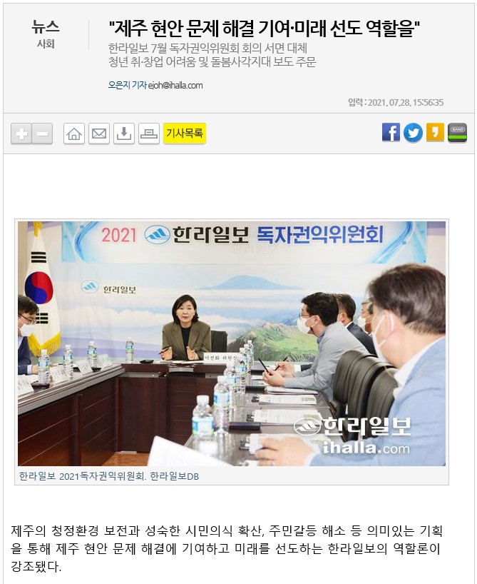 [2021년 한라일보 독자권익위원회] "제주 현안 문제 해결 기여·미래 선...