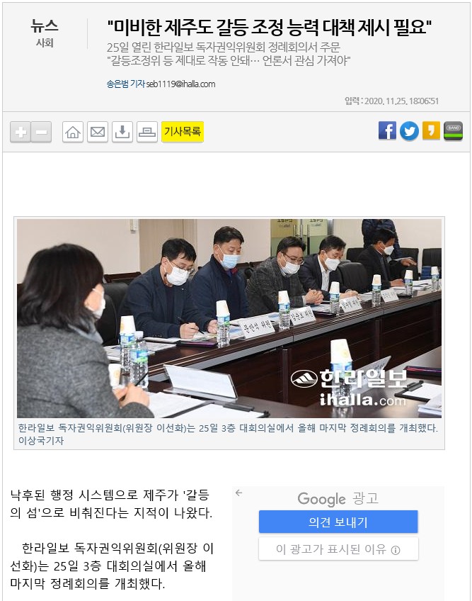 [2020년 한라일보 독자권익위원회] '미비한 제주도 갈등 조정 능력 대책...