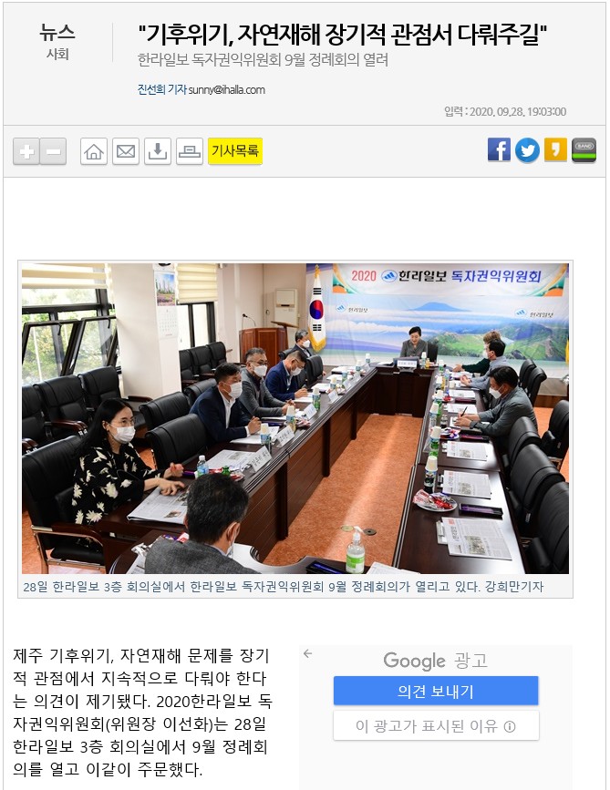 [2020년 한라일보 독자권익위원회] 9월 정례회의 "기후위기, 자연재해 ...